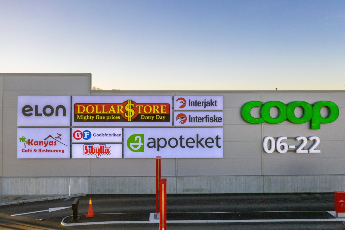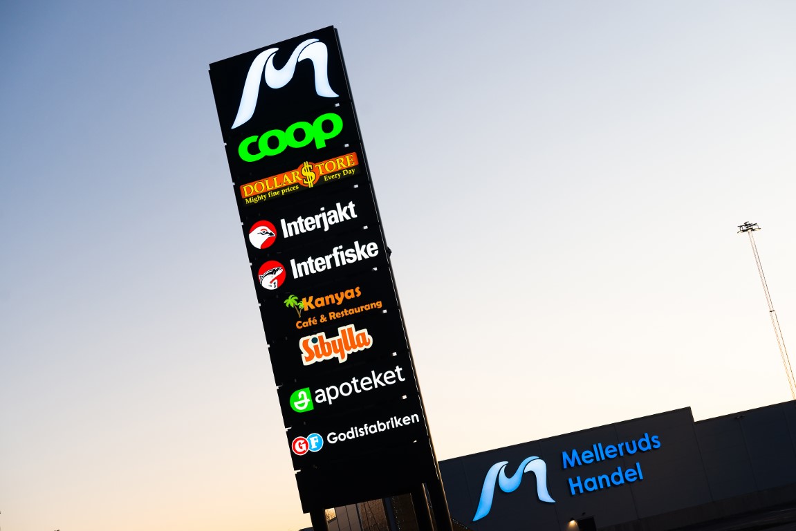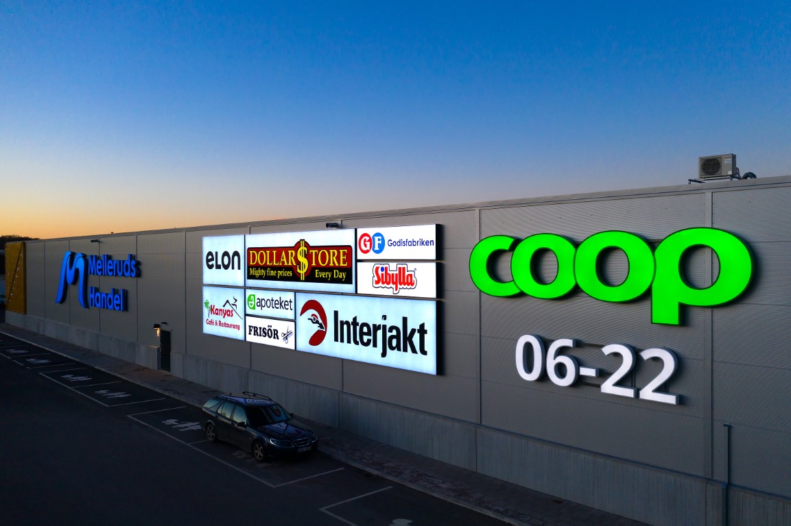 Skyltkoncept tillverkade och monterade all skyltning för Melleruds nya handelsplats. Fasadskyltning med både ljuslådor och 3D skyltar. Pylon med samtliga skyltar för hyresgäster. Invändig skyltning för Coop mfl. Skyltning och drive thru system och menyskåp för Kanyas!